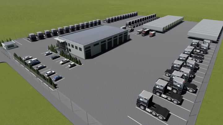 Дилерский центр грузовых автомобилей с региональными складами грузовой техники и запасных частей, включающий производственный корпус, мойку автомобилей, цех по обслуживанию и ремонту прицепной техники и рефрижераторных установок, открытый региональный склад грузовой техники площадью 18 000 м²